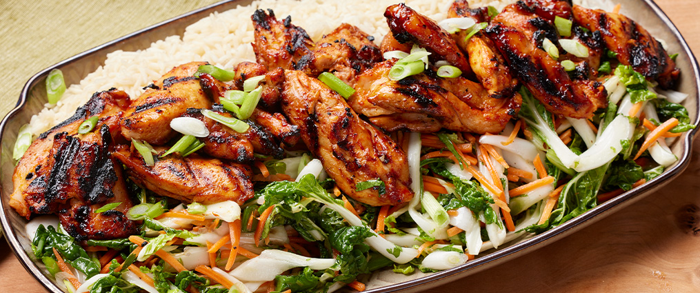 - Enjoy your flavorful Asian-inspired BBQ chicken thighs with the refreshing bok choy slaw and rice!