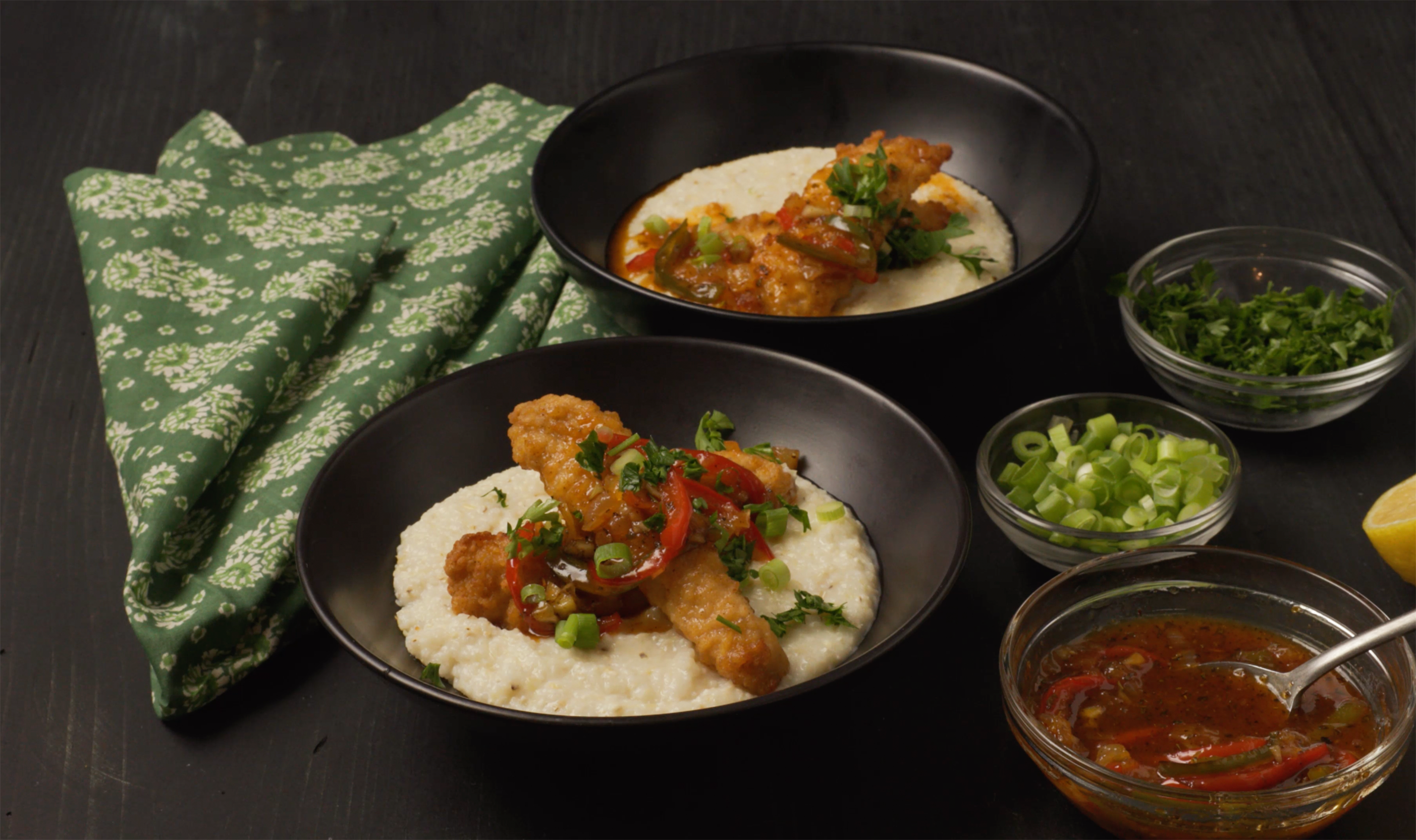 This is a warm and comforting stick to your ribs kind of meal! Enjoy these creamy cheesy grits paired with Just Bare Lightly Breaded Chicken Strips tossed in a unique cajun honey butter glaze.