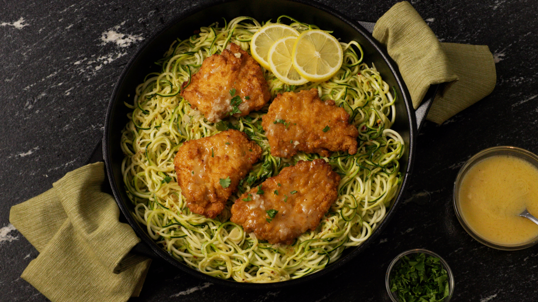 Chicken Francaise consists of lightly breaded chicken served in a white wine, lemon butter sauce. The dish is simple but the flavors work perfectly together along with garlic parmesan zoodles.