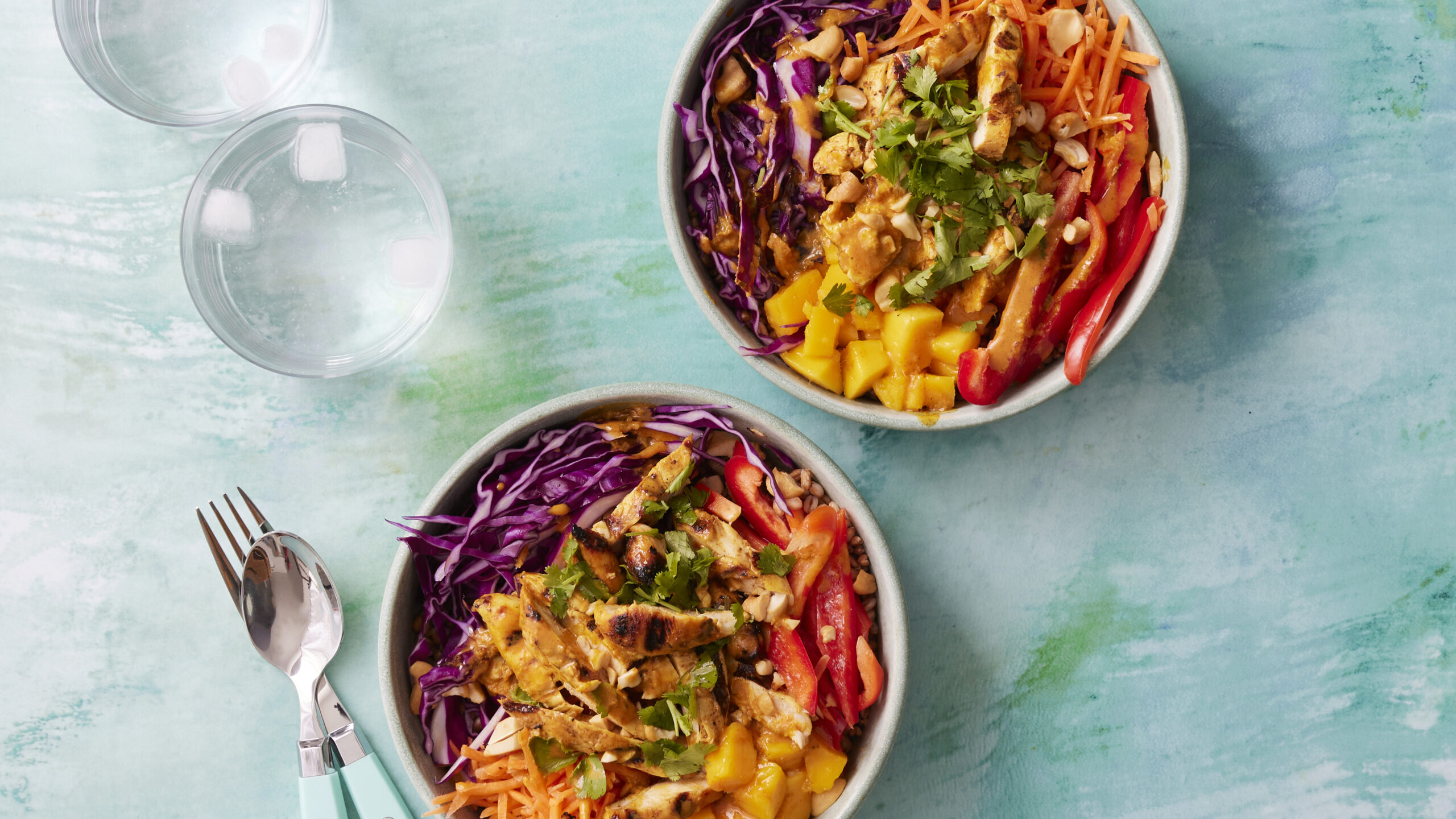 These delicious Creamy Thai Coconut Lime Chicken Bowls featuring Just Bare Boneless Skinless Chicken Breast Tenderloins are the perfect addition to your next summer BBQ. They’re made with grilled coconut and lime-marinated chicken with mango, cabbage, carrot, peanuts and a peanut sauce served over farro for a nutritious twist.