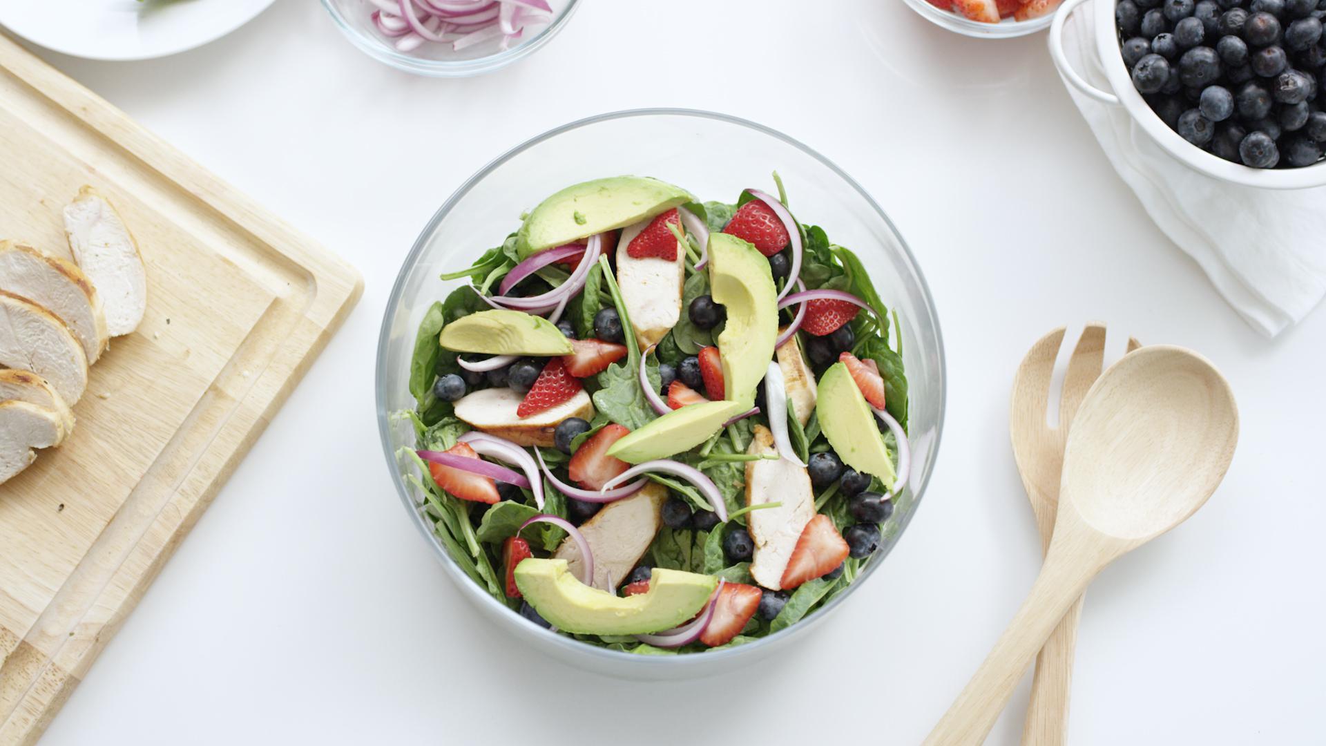 - Meanwhile, whisk remaining 3 tablespoons oil, balsamic, vinegar, garlic salt and freshly ground pepper in a large serving bowl. Top with spinach, berries, avocado, and onion. Gently toss ingredients together until well coated with dressing.