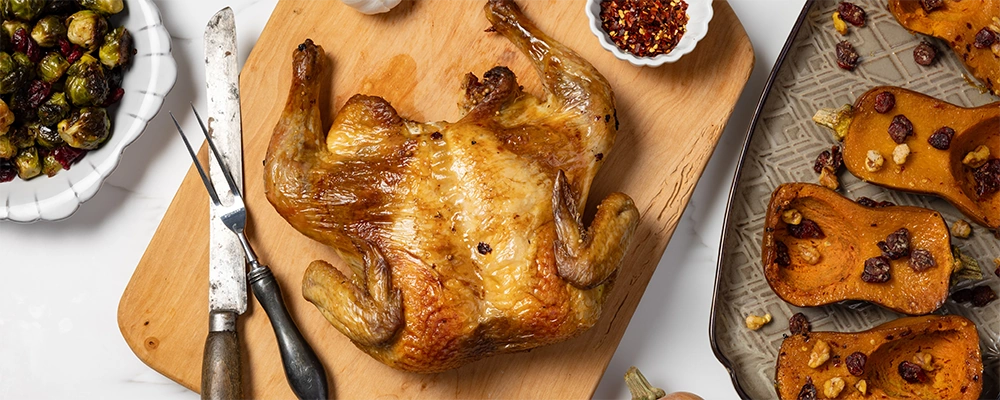 - Transfer the chicken to a large rimmed baking sheet, skin side up. Roast for 45 minutes, until the skin is browned and an instant-read thermometer inserted in an inner thigh registers 160°F. Transfer the chicken to a cutting board and let rest for 10 minutes before serving.