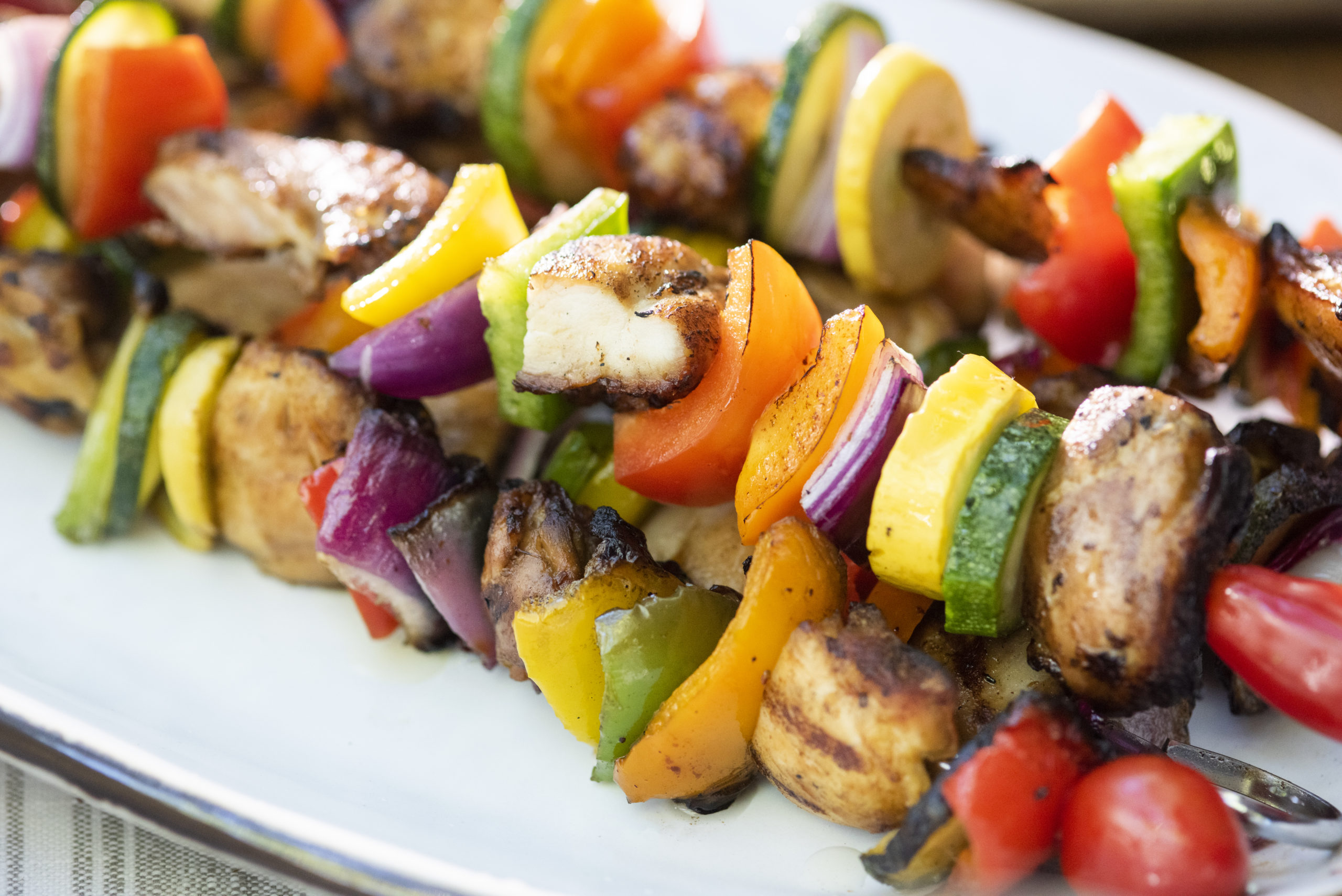 - Assemble kabobs either on wood or metal skewers. If you use wood, soak them in water first for several hours so they don’t ignite on the grill. Lightly brush skewers with olive oil and sprinkle remaining rub on vegetables.