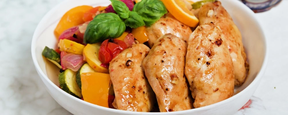 Get ready for a flavor-packed feast to celebrate National Chicken month with this bright citrus-glazed Chicken Thighs! All of the delicious vegetables of the season pair perfectly with this hearty meal- enjoy it now before the summer fades away.
