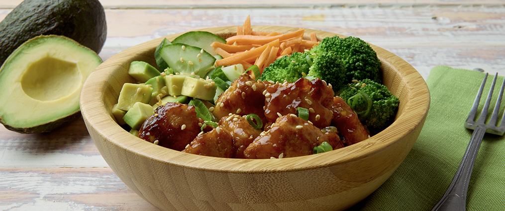 - Add the riced cauliflower into bowls. Add in the cooked broccoli, shredded carrots, cucumber slices, and avocado. Add the chicken on top and garnish with sesame seeds and green onions.