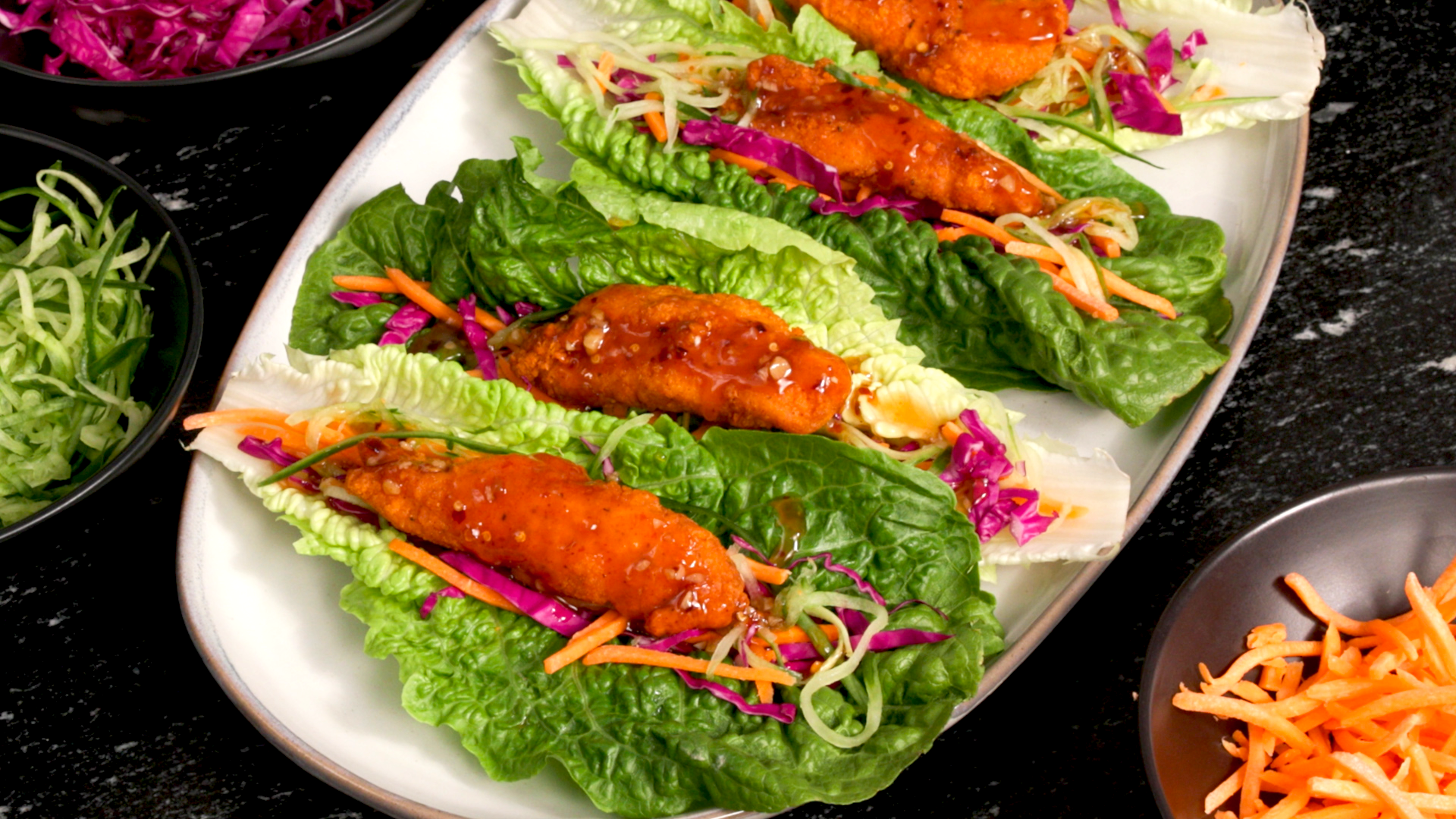 - To assemble, place one piece of romaine lettuce on a plate, followed by your desired amount of sliced carrot, cucumber and cabbage. Place 1 chicken strip and top with sweet chili sauce and garnish with sliced green onions.