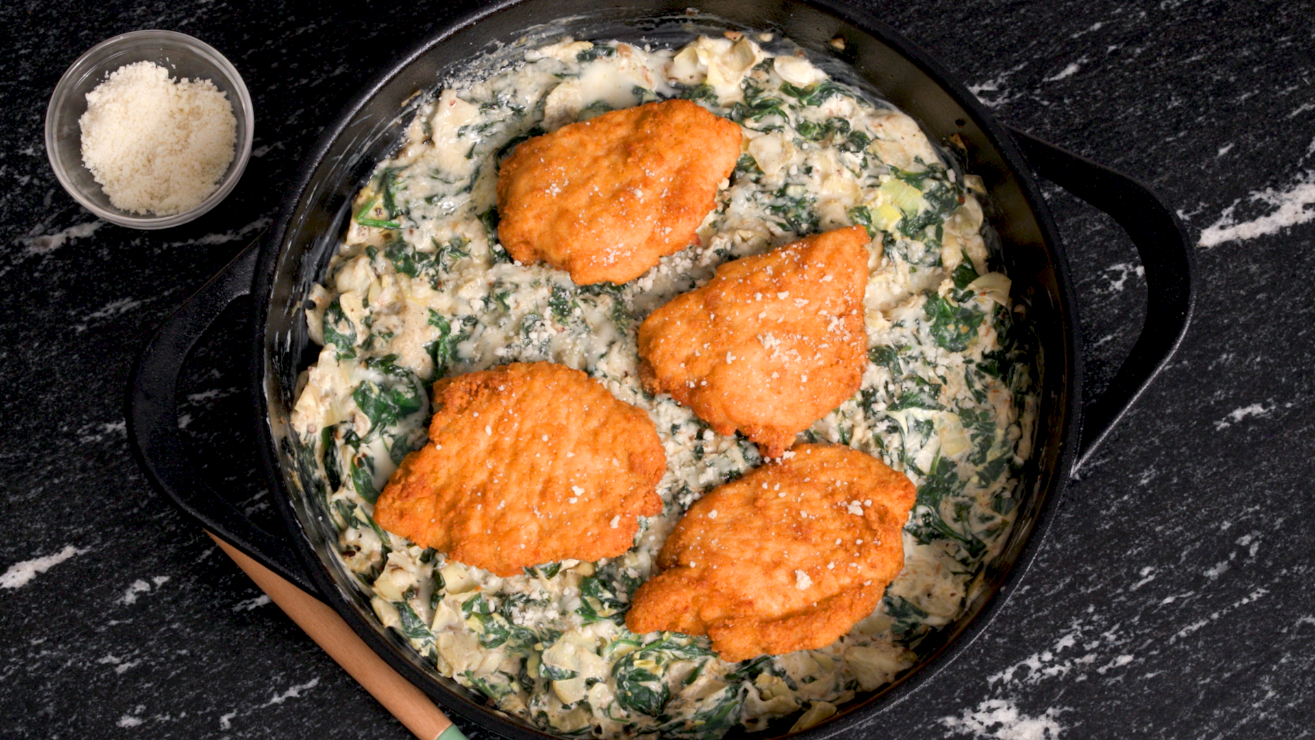 - Once chicken is cooked through, place on top of spinach and artichoke mixture in pan and top with additional cheese if preferred.